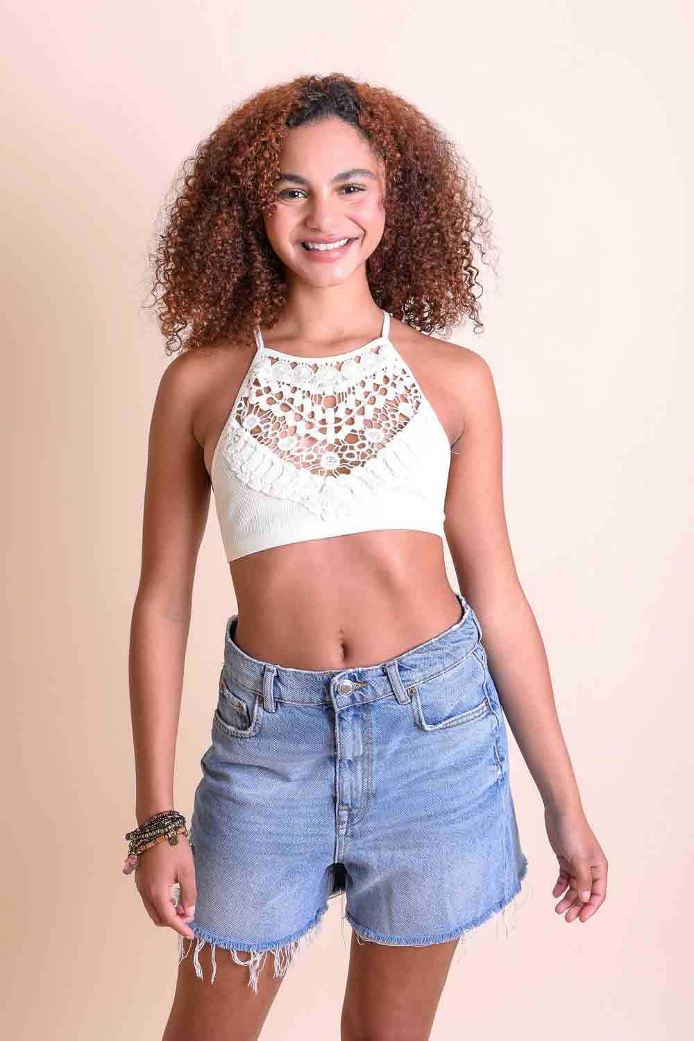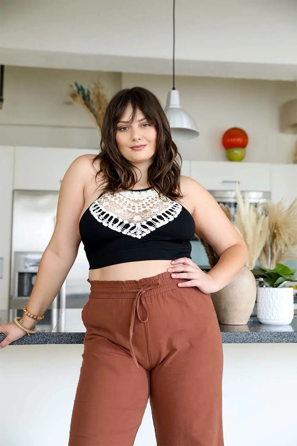 Crochet lace, high neck bralette with a criss- cross strap in back. Perfect for under your tanks or graphic T’s this summer. Available in three color options, Ivory, black, and sage green! Sizing is xs/s or m/l. Cup Fit XS-S: 32A 32B 32C 34A 34B M-L: 32D 34C 36B 36C 38B
