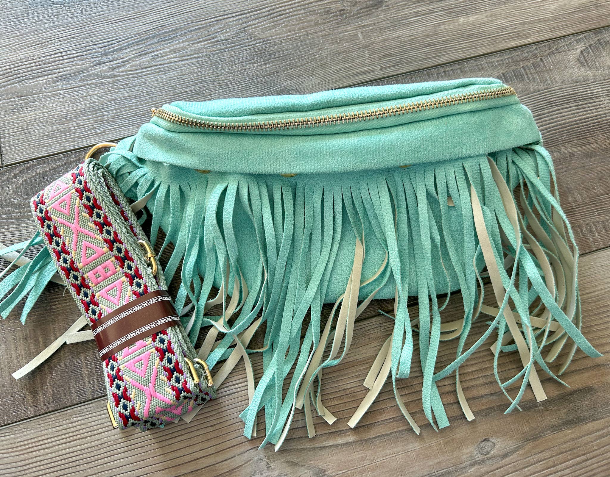 Fringe is removable. Bag comes with strap shown. Bag measures 12" by 5" by 3" Strap extends to 50" Strap can be exchanged with any other strap with clips. Available in black and turquoise.