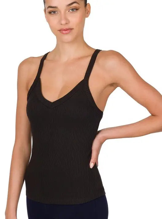 The perfect ribbed cami tank top! V-shaped strap in the back for extra personality in a basic tank. Soft, stretchy, and the perfect length. This fits a little more like a crop but sits perfectly with a mid rise or high rise jean, 17” inch in length right at the hips. Available in three colors.
