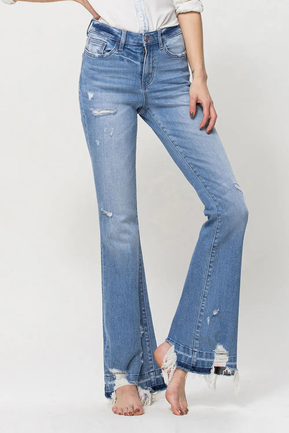 High Rise w /release hem 93% cotton,5% polyester,2%spandex ,medium wash.